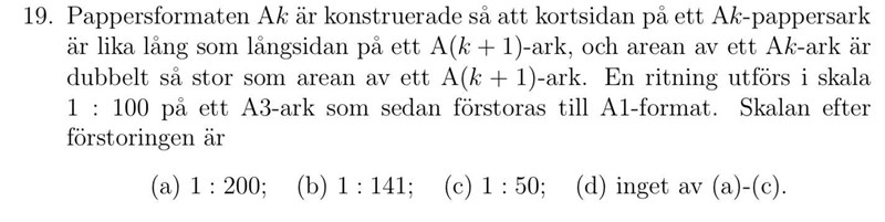 Arean ökar 4x. Om skalan mellan kartan och verkligheten innan kartans area ökade 4x var 1:100, borde väl den vara 1:25 när arean ökar 4x. Rätt svar är c, 1:50. Varför?
