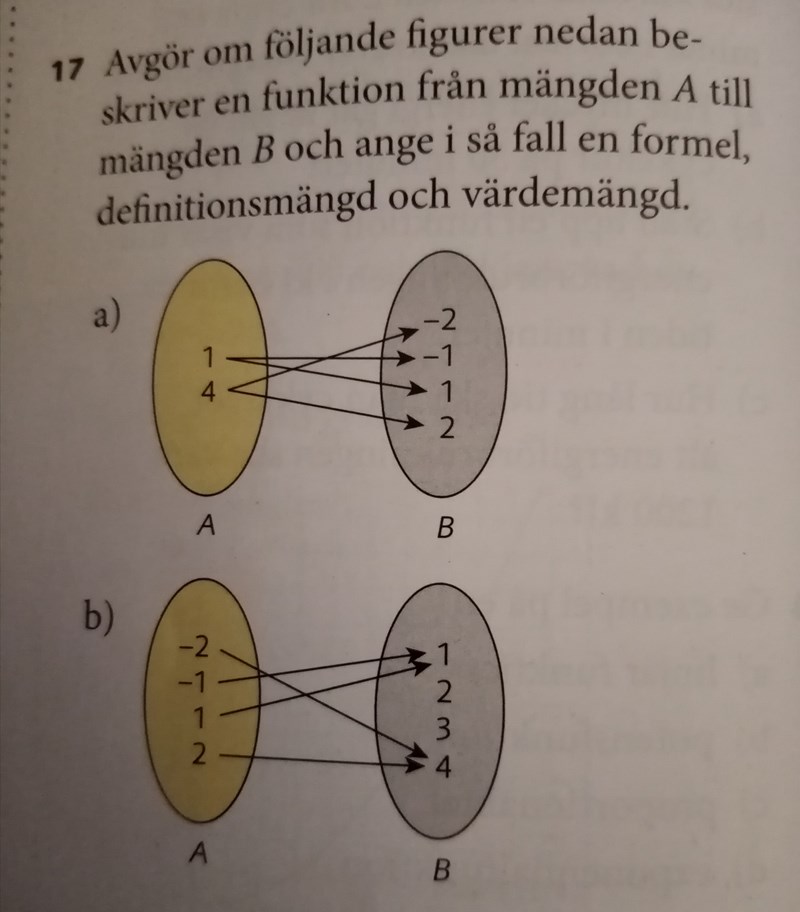 En funktion fungerar så att om du stoppar in samma in-värde så skall du alltid få ut samma ut-värde. I a) får man ibland -2 om man stoppar in värdet 4 och ibland får man utvärdet 2 om man stoppar in 4, och om man stoppar in 1 får man ibland -1 och ibland 1.