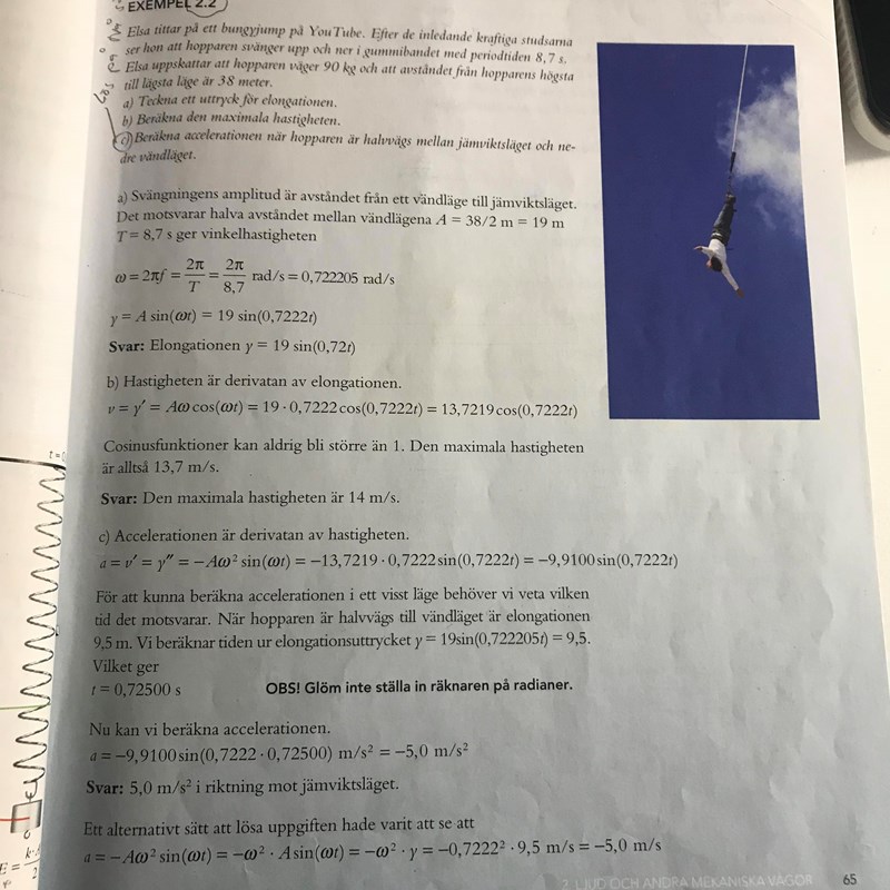 Det är oklart vilket håll som är positivt och negativt, men det gör inte så mycket. Det viktiga är att elongationen vid den tidpunkt som de betraktar är positiv, och accelerationen är negativ. Accelerationen är alltså riktad tillbaka till jämviktsläget. Om elongationen hade varit -9,5 så hade accelerationen blivit 5,0 m/s, också den riktad mot jämviktsläget, men nånstans i andra halvan av rörelsen.