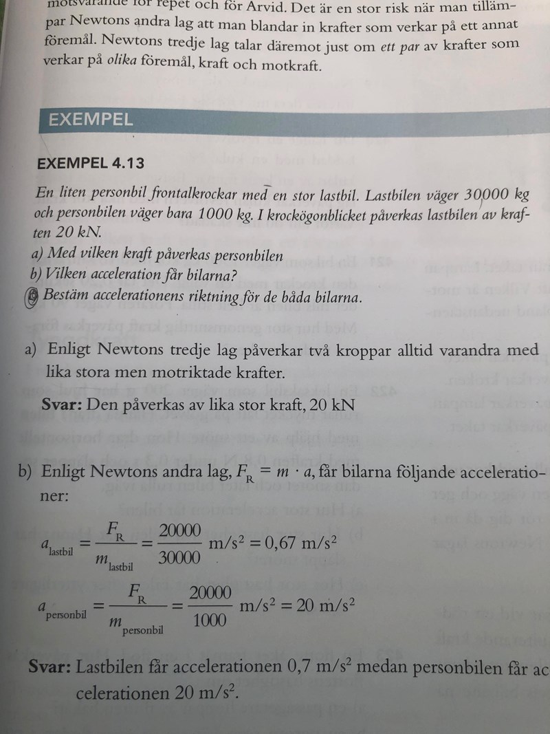 Jag inte förstår man ska tänka i c uppgift. Varför ska accelererationen vara riktad bakåt? Hur ska man veta riktningen?