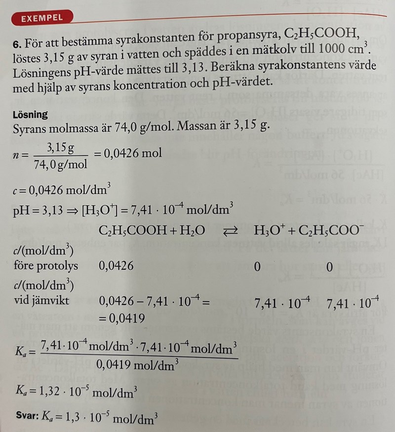 Jag läste igenom detta exemplet i min lärobok som du kan se nedan. Jag förstår inte riktigt varför de har skrivit att c för C2H5COO- är densamma som c för H30+ vid jämvikten? Jag antar att det är för att c av C2H5COO- måste vara lika hög som c för H30+. Men varför är det så? Jag skulle uppskatta om någon kunde förklara detta för mig!