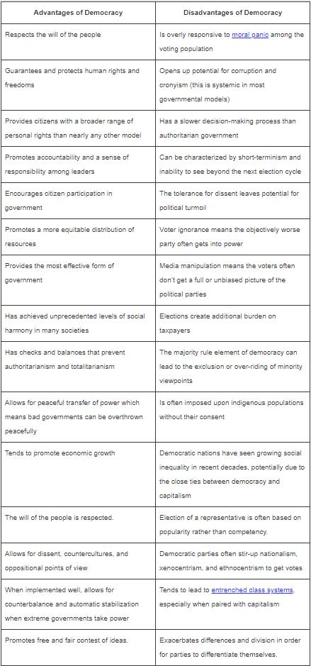 Om du exempelvis googlar "pros and cons of democracy" eller liknande så får du en hel del träffar med mycket information.