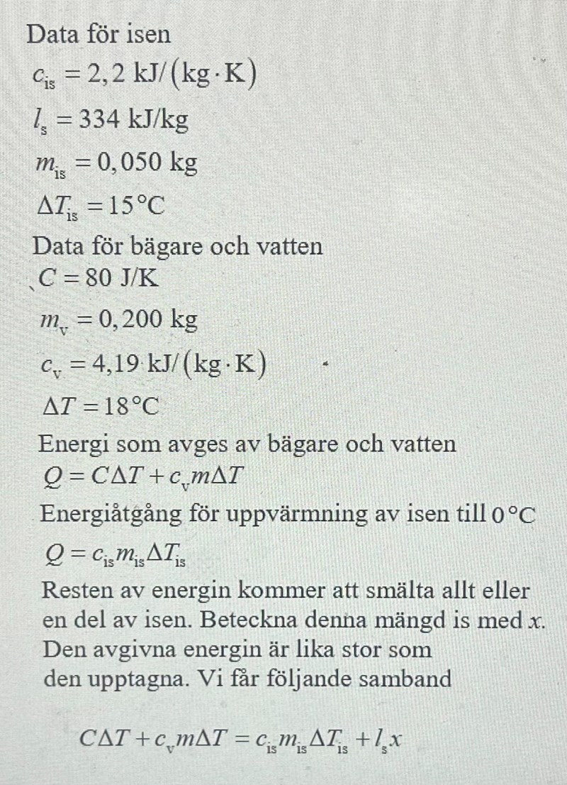 Jag håller på med denna uppgift som du kan se nedan. Nedan kan du även se en del av lösningsförslaget. I lösningsförslaget så säger de att den avgiva energin är lika stor som energin som krävs för att smälta isen. Nu har jag två frågor kring det. Först undrar jag vad för energi det är som avges? I lösningsförslaget står det att det är vattnet och bägaren som avger energin, men hur kan de göra det? Varför avger vattnet och bägaren energin från första bärjan? Sen så undrar jag hur de vet att den avgiva energin är lika stor som den upptagna energin?