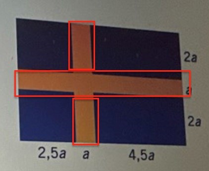 De två andra rektanglarna är de vertikala gula fälten ovanför och nedanför den det horisontella fältet. En av rektanglarna är 2a hög och a bred, arean 2a * a. Eftersom det är två stycken är deras area 2 * 2a * a.