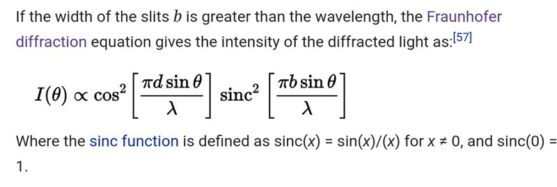 Man kan säga att interferensmönstret består av en interferensdel från punktkällor i spalternas mitt och en diffraktionsdel. Diffraktionen gör att intensiteten avtar och aldrig kommer tillbaka i närheten av centralmax efter sitt första minimum. Frågor på detta?
