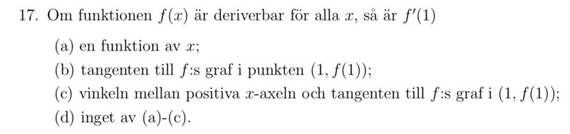 Jag svarade alternativ b. Tydligen är alternativ d rätt. Jag undrar, varför är b inte rätt? Derivatan av en funktion i en punkt, är väl också tangenten till funktionen i samma punkt?