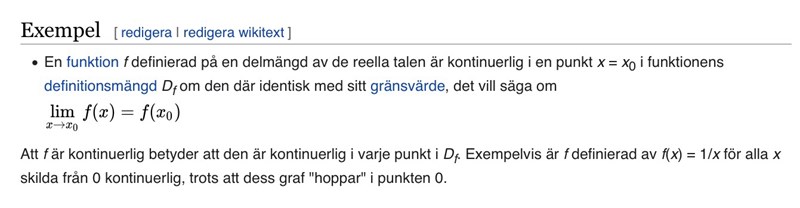 En kontinuerlig funktion är en funktion vars värde, vid varje punkt i dess domän, är lika med dess gränsvärde vid samma punkt.