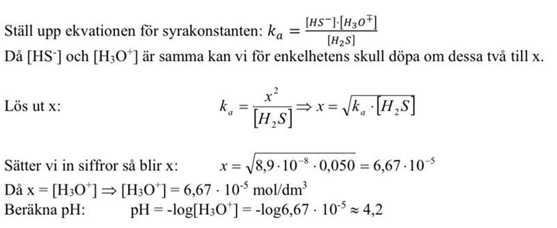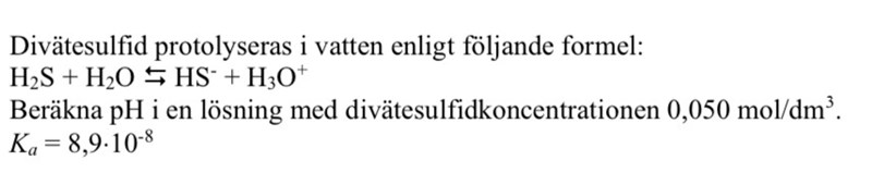 Jag håller på med denna uppgift som du kan se nedan. I lösningsförslaget (som du också kan se nedan) så stod det att koncentrationen HS- och H3O+ är densamma. Jag undrar varför det är så? Beror det på att molförhållandet är 1:1? Jag uppskattar all hjälp!