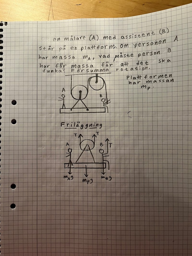 Jag tror att jag förstår varför person B:s normalkraft inte ritas ut, för jag kommer ihåg att läraren sa att det är ett gränsfall och att person B ska precis "lyfta". Men varför tar man inte med person A:s normalkraft i friläggningen?