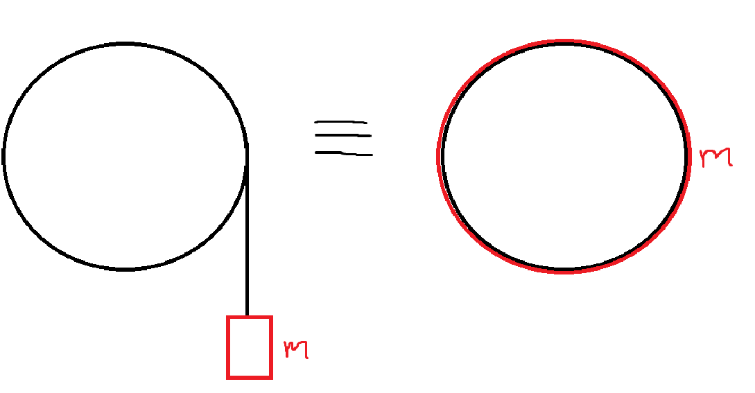 Om man ersätter den där vikten med samma massa m fördelad på en tunn ring längs hjulets kant får vi ett ekvivalent system där massan m fortfarande har samma tangentialhastighet och samma hävarm R.