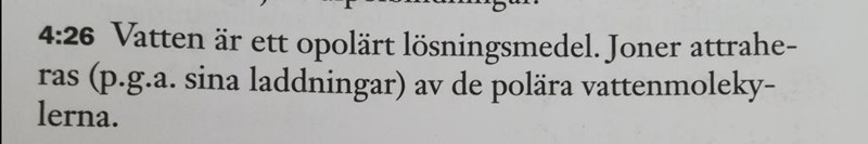 Kan du lägga in en bild av facit? Det verkarsom om det har hamnat ett "o" för mycket där. Vatten är polärt, och bildar jon-dipolbindingar till saltets joner.