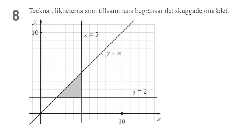 Slutligen har du linjen y=x. Det gråa området ligger under linjen. Om det känns svårt att se vad villkoret ska vara, prova några olika punkter inom det gråa området och några utanför. T ex (4,3) och (2,4). Vilken ligger inom respektive utanför området? Är y<x eller y>x för alla punkter under linjen?