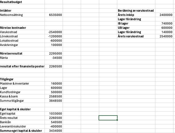 Hej, jag ska slutföra en resultatbudget, likviditetsbudget och en budgeterad balansräkning med hjälp av denna information: