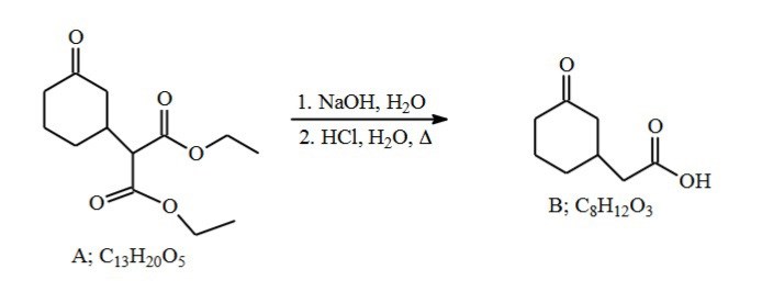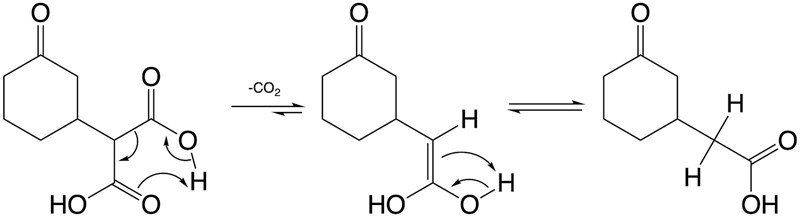 Dekarboxyleringar sker gärna från en beta-ketosyra eller ester. Men efter steg 1 finns det vare sig ester eller ketosyra. Men det viktiga för denna typ av dekarboxylering är att det finns en karbonylgrupp på beta-positionen, vilket det finns i produkten från steg 1.