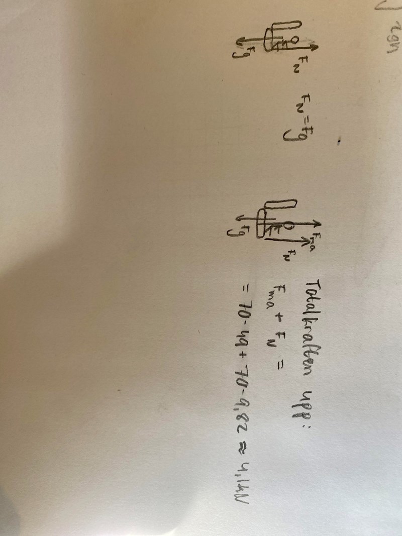 Normalkraften - mg = ma, borde inte detta bli 0 även på bild nummer 2 eftersom normalkraften och tyngdkraftens kraftresultant blir 0? Jag checkade facit nyss, och svaret blir tydligen att det finns två krafter som påverkar piloten när han skjuts ut med accelerationen 49m/s2, kraften från stolen (4100 N) och tyngdkraften (690 N).