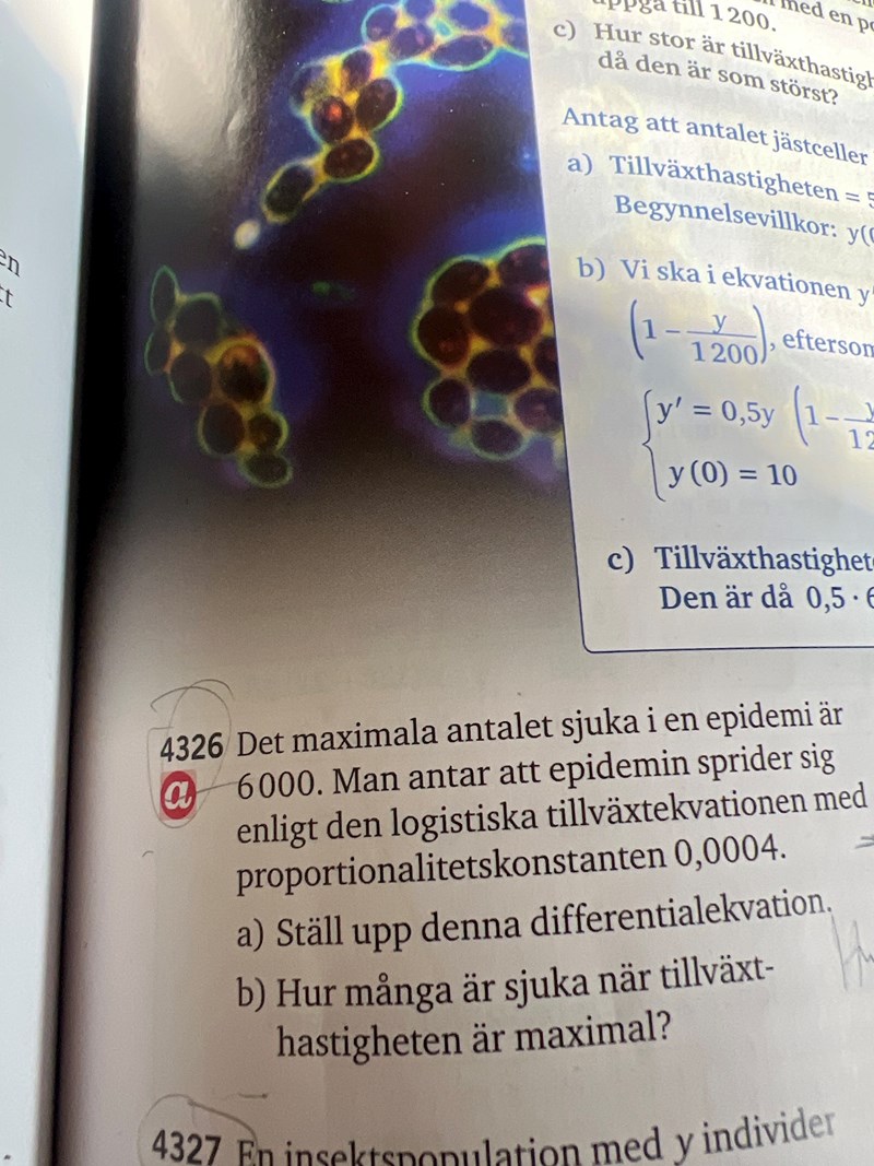 Enligt facit blev differential ekvationen y’=0.0004y(6000-y), varför blev det just 6000-y. I den tidigare sidan står det att formeln som används är y’=ky(1-y/M), där M är populationens maximala storlek.