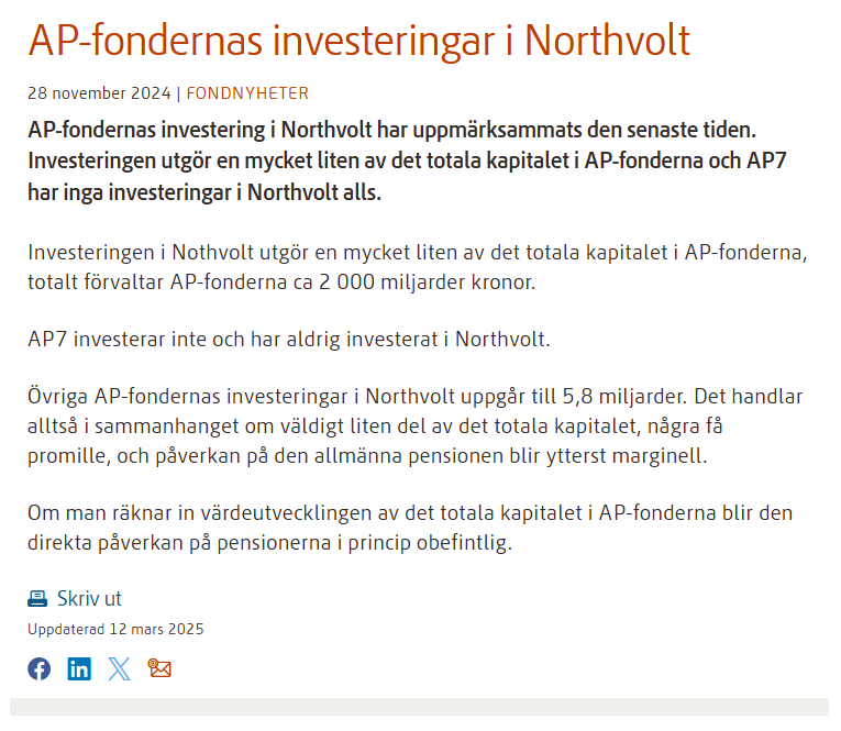 Northvolts konkurs är dock väldigt betydelsefull ur politiskt och samhälleligt perspektiv, ja självklart, många sparkade, skakar Skellefteå kommun som hade stora satsningar i fabriksområdet, påverkar Europas gröna omställning och oberoende av Kina osv. Men det är dessa orosmoment som på något sätt verkar spillt över till och blandat in pensioner och bla bla bla vilket överhuvudtaget inte är relevant.