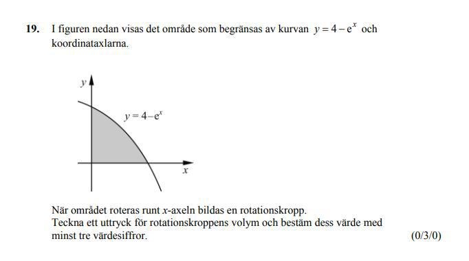 Dock så är rätt svar 17.8 ( mitt blir ca 28.3 ). När jag kollade på hur andra löste det så verkar det som att de bestämmer den primitiva funktionen annorlunda, dvs genom att utveckla parantesen (4-e^x)^2 och sedan göra en primitiv funktion av det. Jag förstår hur det fungerar, vad jag är mer nyfiken på är varför mitt sätt blir fel.
