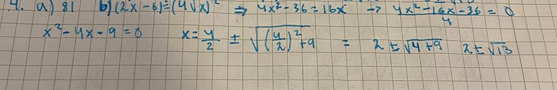 Hejsan! Lyckas inte lösa 4b. svaret ska bli x=9 men jg får det till 2+-roten ur 13