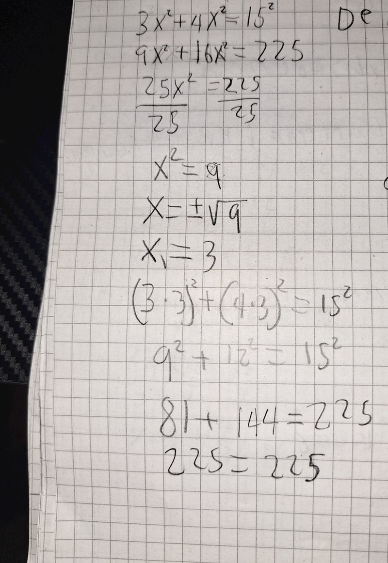 Jag råkade lösa den men nu när jag kollar tillbaka fattar jag inte logiken bakom det hela, hur kan 3x^2 bli 9x^2 som uppgiften vill och facit vill också. Jag skulle ha tänkt om jag gjorde om den att 3x^2 ska bli 9x bara. (Pythagoras sats, beräkna vinkelns sidlängder. Katet 1=3x, katet 2=4x, hypotenusan=15)
