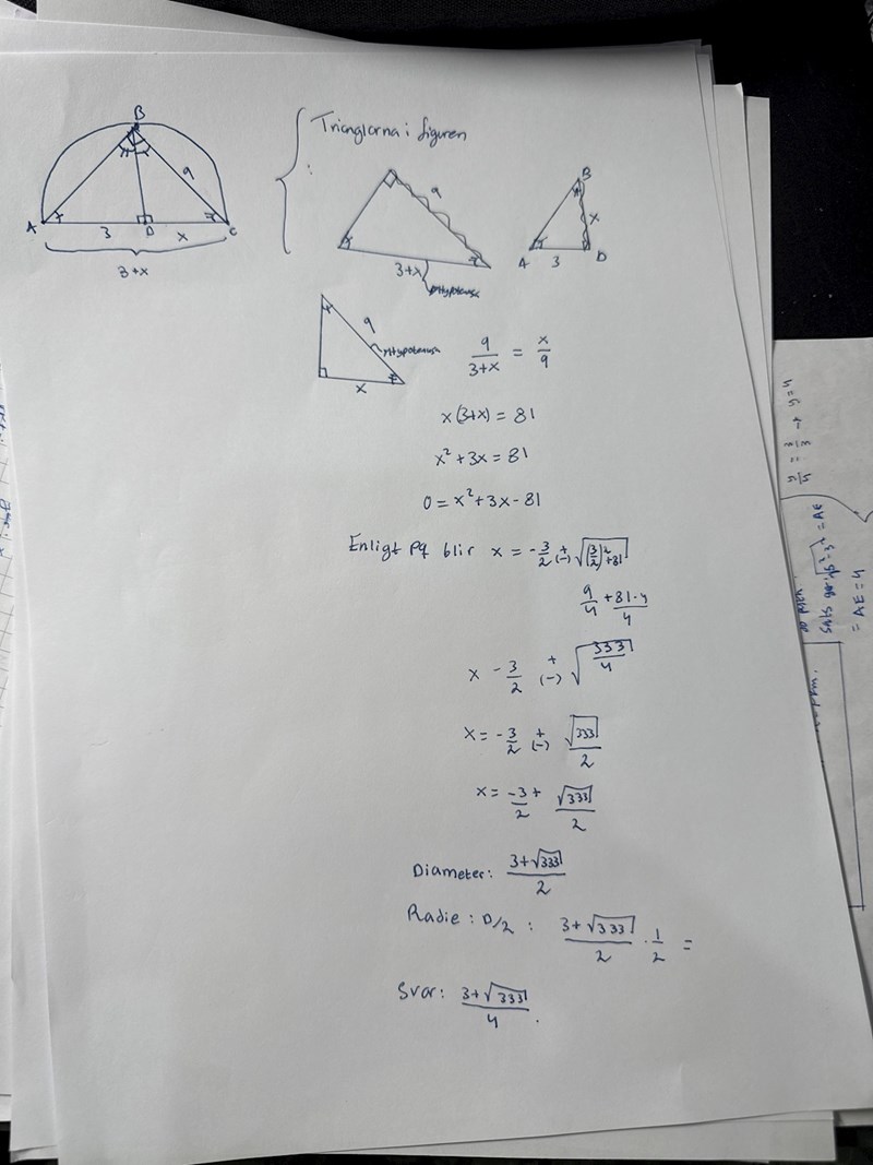 Jag förstod vad du menade, men jag förstår inte vad du menar nu. Är det facit du postat? Det har isf betecknat diametern som d, och då måste CD bli d-3. Vad är det som är oklart med det? Vill man betrakta den som du gör får man att diametern blir x+3 och CD blir x.