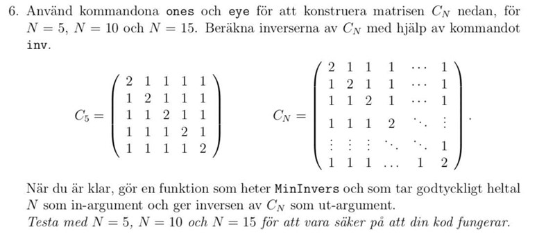 Hej! Jag försöker att beräkna matriserna Cn för N = 5, N = 10 och N = 15, men det blir inte riktigt rätt för alla N. Är det någon som kan se vad jag gör för fel?
