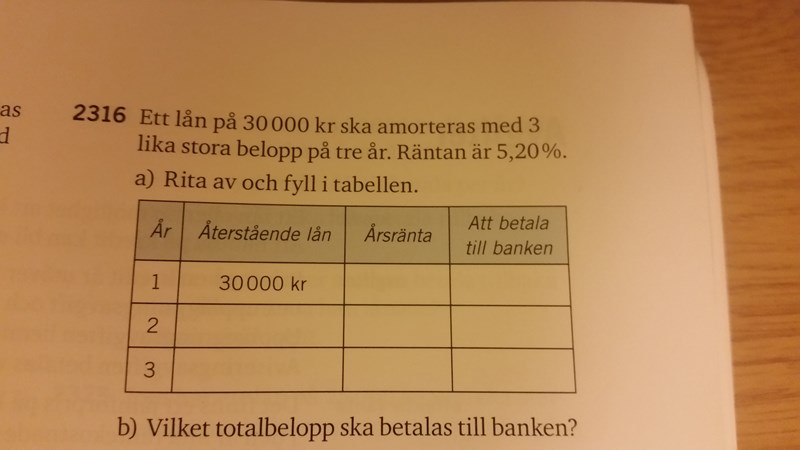 på fråga 2316 b kan man använda två metoder, Det ena är att fylla i tabellen och sedan addera alla årsräntor med 30 000 och då blir det 33120 kr, vilket är rätt.