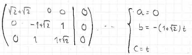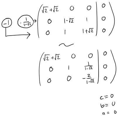 Jag tror videon kan ha räknat fel. Om vi gångrar mittenraden med 1+rot2 får vi (0,- 1 ,1+rot2), där 0 och 1+rot2 stämmer med sista raden men inte 1 / -1
