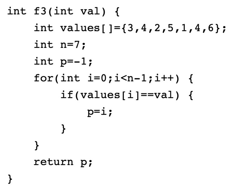 Uppgiften handlar om att ta reda på vilket värde som retuneras när f3(4) anropas. Jag förstår verkligen inte varför 5 retuneras och inte 1? Både element 1 och element 5 antar ju värdet 4 så det förstår jag, men jag förstår inte varöfr svaret inte blir 1 när i=1 uppfyller alla kraven? Måste ju missa något väldigt uppenbart.