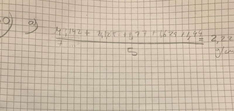 Jag får svaret 2.22g/cm3 men mitt svar är fel. Vart är felet i min uträkning? Jag beräknade densiteten för vätskorna och adderade därefter alla beräknade densitet och delade med 5 för det finns 5 st vätskor. Vad är felet i min uträkning?