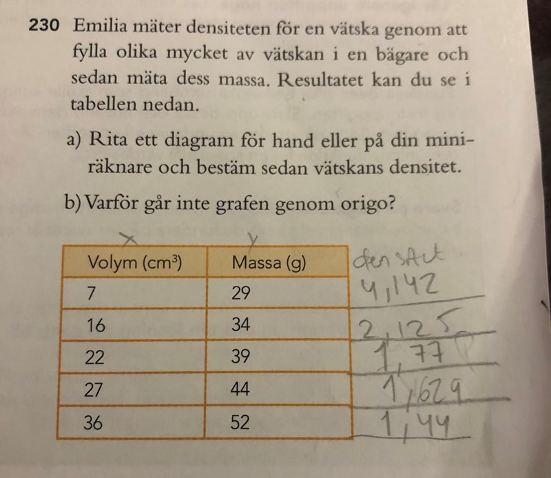 Men när det kommer till att räkna ut densiteten för var och en av vätskan delat med 5 blir det fel. Densiteten är lutningen på linjen som då är ~0.8