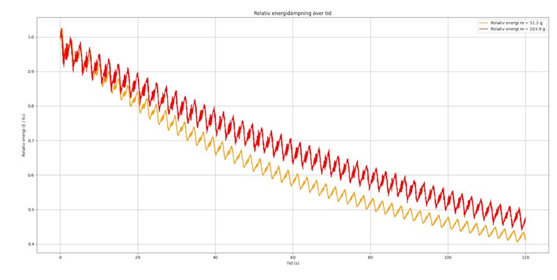 Vid analys av två pendlar med identiska dimensioner men olika massor visade det sig att den lättare massan dämpades betydligt hårdare än den tyngre massan, till den grad att dess dämpningskonstnat var dubbelt så stor som den tyngres, ! Efter en plot av hur systemens "relativa" mekaniska energier () förändrades med tiden syns detta också: