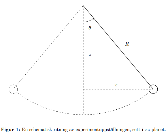Jag utförde nyligen en laboration på en pendel enligt min figur nedan. Man släppte en pendel med en massa från en höjd och lät den svänga. Medan pendeln svängde användes ett sofistikerat kamerasystem för att spåra pendelns koordinater över tid.