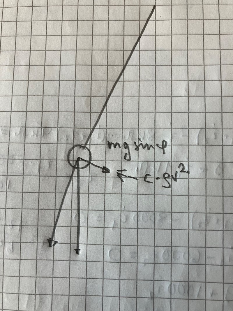 Kraften som accelererar massan är m g sin -c v2. Om v är samma och massan blir mindre så förändras denna kraft.