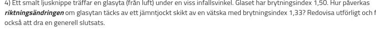 Laguna skrev:Det är en korrekt tanke i det du gör, men formlerna stämmer inte. sin(i1) - sin(b1) är inte en vinkel eller vinkelförändring. Rita en bild och ställ upp brytningslagen som vanligt, för de båda fallen.