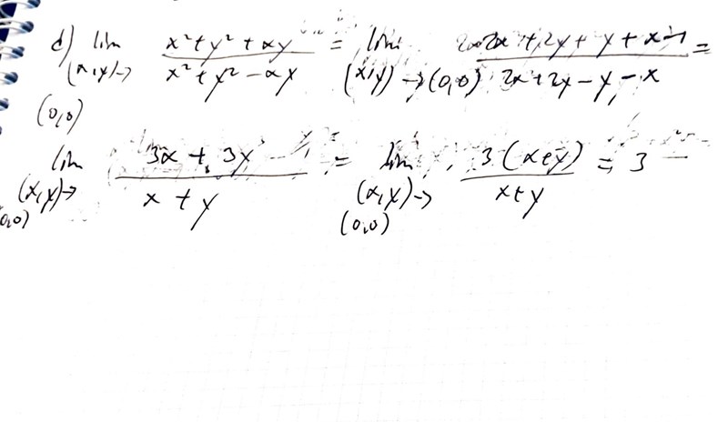 Om man vet att gränsvärdet existerar, så kan beräkna det med L Hopital, för då måste gränsvärdet vara oberoende av vägen mot gränsen. Då kan man använda bekvämaste möjliga väg d v s låta y bero på x på något trevlgt sätt för att få något endimensionellt. Men i motsats till det endimensionella fallet får du inget existensbevis på detta sätt (såvida det inte finns någon för mig okänd typ av utvidgning av L Hopital till fler dim än 1) Existensen måste man få fram på något annat sätt. I det här aktuella fallet fick jag olika gränsvärden om jag satte y=x resp. y=-x. Gränsen blir då inte oberoende av vilken väg man väljer, varför gränsvärdet inte existerar.