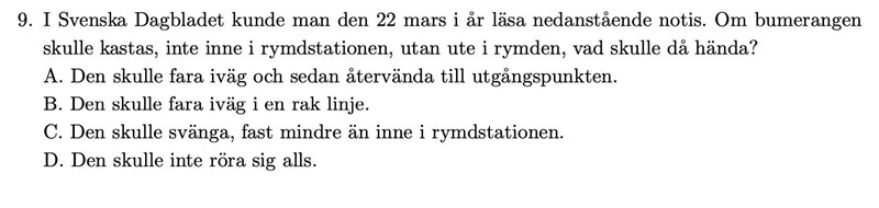 Då kvarstår frågan, kommer boomerangen att svänga överhuvudtaget? Tja, svängningen/bågrörelsen vi ser på jorden kommer väl ifrån att boomerangen saktar ned pga. luftmotstånd, medan rotationen inte påverkas lika mycket av luftmotståndet, så att boomerangens rotation kontra kasthastighet varierar? Men i rymden påverkas inte boomerangen av något luftmotstånd, så boomerangen kanske färdas snett, men den borde inte svänga. Då kvarstår bara alternativ B.