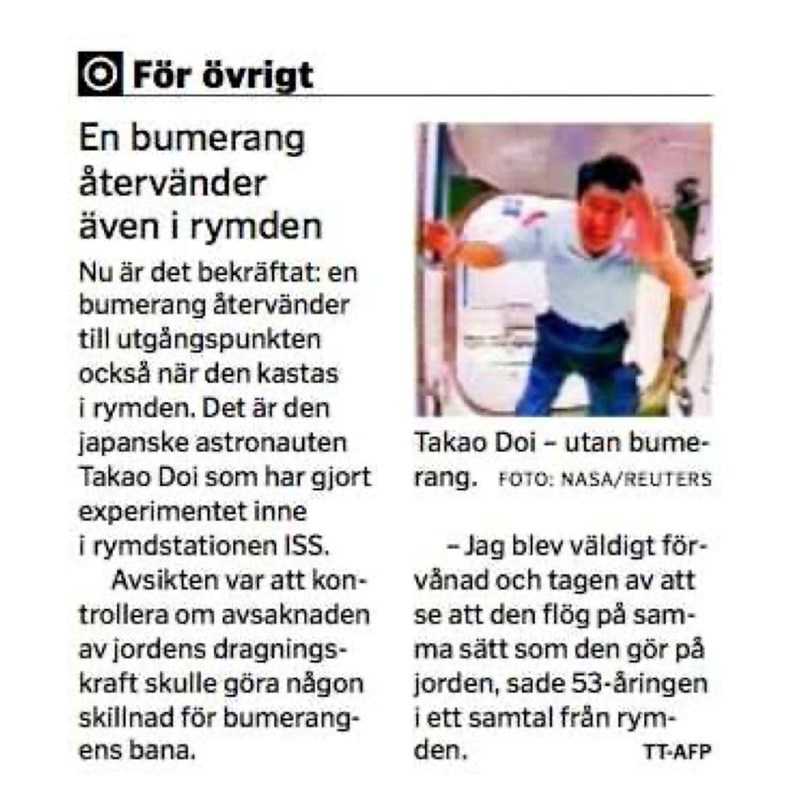 Varför far en bumerang i rymden iväg i en rak sträcka om man kastar den i rymden?
