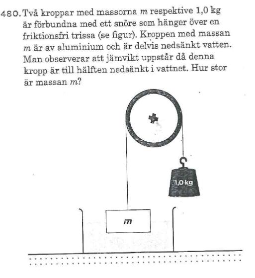 Eftersom systemet är i vila är kraftsumman noll. Således gäller att . Dessutom vet vi att volymen i formeln för lyftkraft kan skrivas om med hjälp av aluminiums densitet: