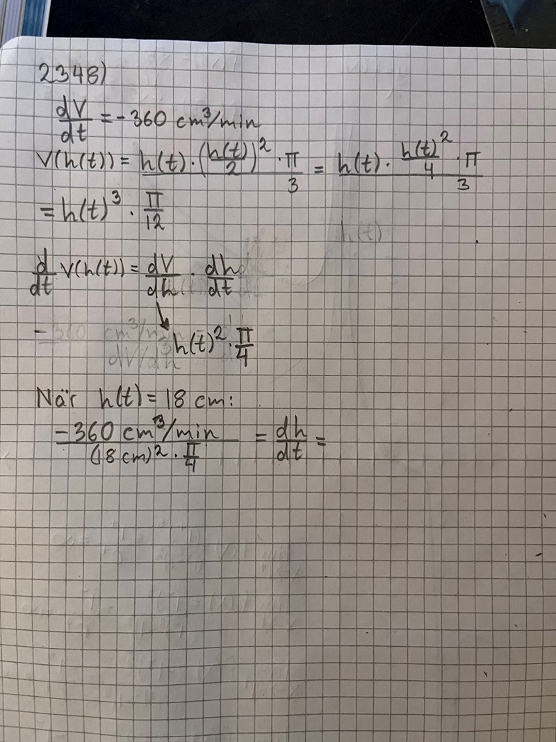 En konisk behållare har spetsen nedåt och lika stor höjd som radie. Behållaren läcker så att det rinner ut 360 cm3/min. Med vilken hastighet förändras vätskenivån vid det läga då den är 18 cm?