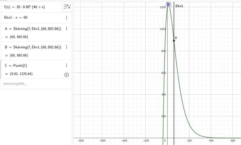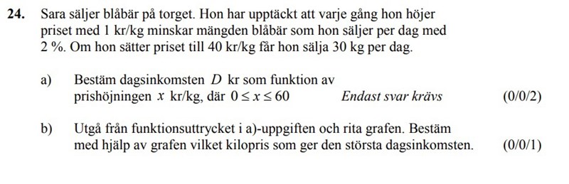 Det är meningen att du skall läsa av vilken ökning som ger den största dagsinkomsten, d v s x-koordinaten för punkten c. Kom ihåg att kilopriset är 40 kr plus detta!