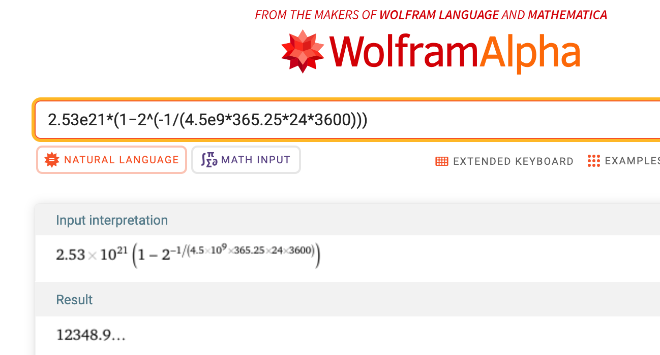 Det går inte med miniräknare eftersom den använder för få gällande siffror. Den kan inte hantera 1 sekund delad med antalet sekunder i 4,5 miljarder år, det är typ 10-17. Den ger att någonting upphöjt till nästan noll är lika med 1.