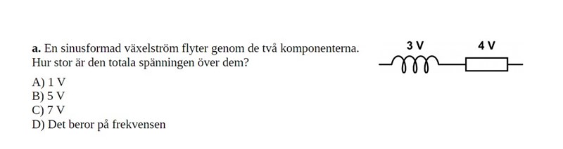 Använd vektorer. Du har en rent induktiv spänning på 3V. Den brukar man rita rakt upp. Du har en rent resistiv spänning på 4V och den ritas vågrätt. Då kan du tänka på triangeln med sidorna 3 och 4. Vad är då hypotenusan.
