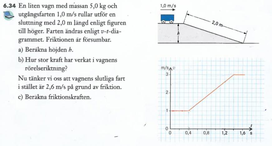 Jag har försökt lösa uppgift b) på två sätt, men endast ett verkar fungera. Mitt första sätt är att använda F=ma. Jag kan räkna ut den genomsnittliga accelerationen under nedfärden till 2 m/s2 och massan står given i uppgiften.