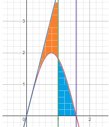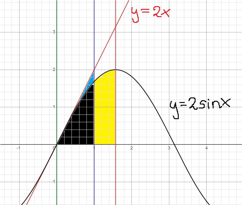 Det svarta området är området som båda kurvorna delar. Det blå området är arean som endast linjen bildar med x-axeln, och det gula området är arean som endast sinuskurvan bildar med x-axeln. Som man kan se är det gula området väldigt mycket större än det blå, så det ser ju ut som integralen för sinuskruvan borde vara större? Men värdet blir samma. En grafisk tolkning verkar i alla fall inte komma på fråga.