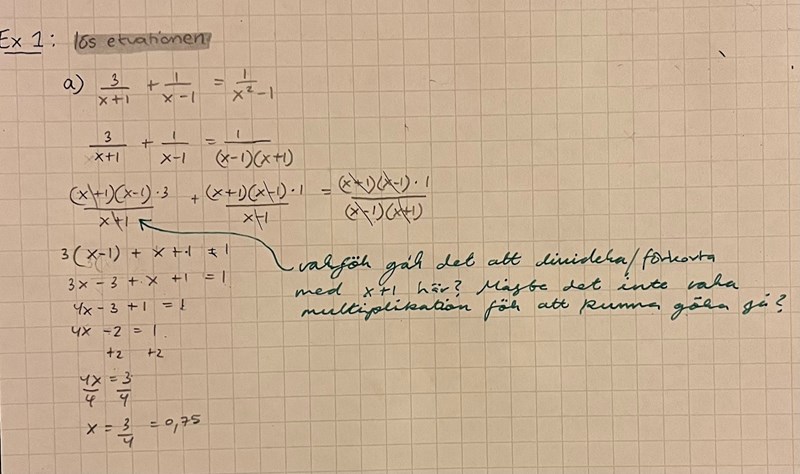 Jag har löst denna ekvation med rationella uttryck som du kan se nedan. Jag undrar bara varför det gör att dividera/förkorta x+1 med x+1 i det tredje steget (se bilden nedan)? Jag har tidigare fått lära mig att man endast kan göra så när det är multiplikation, men här verkar det vara ett undantag, varför då?