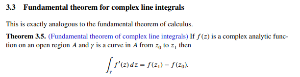 där är en parametrisering av som löper från till . Jag har läst att det finns en komplex version av infinitesimalkalkylens fundamentalsats för reella integraler, t.ex. här