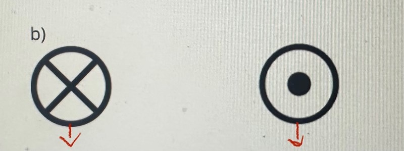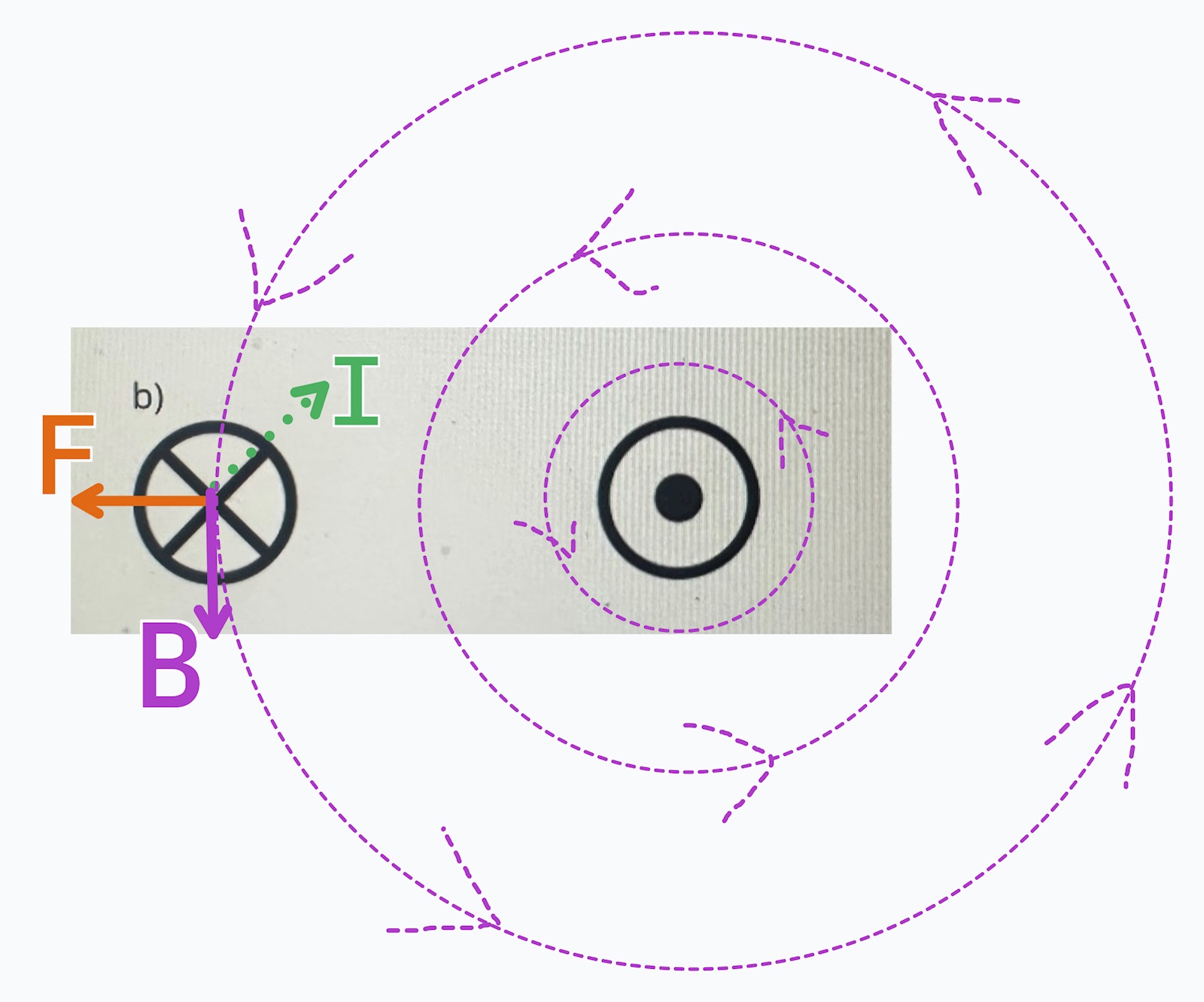 Jag förstår hur magnet fältet rör sig i den högra ledningen (ström går ut från papperet) men jag förstår inte vad som händer med strömmen från den vänstra (ström går in i pappret)