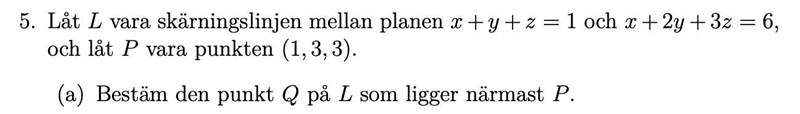 Om du har en linje Q(t) = Q0 + t och en punkt P, så är den punkt Q(t) på linjen som ligger närmast P sådan att vektorn är vinkelrät mot linjen, dvs vi har villkoret att