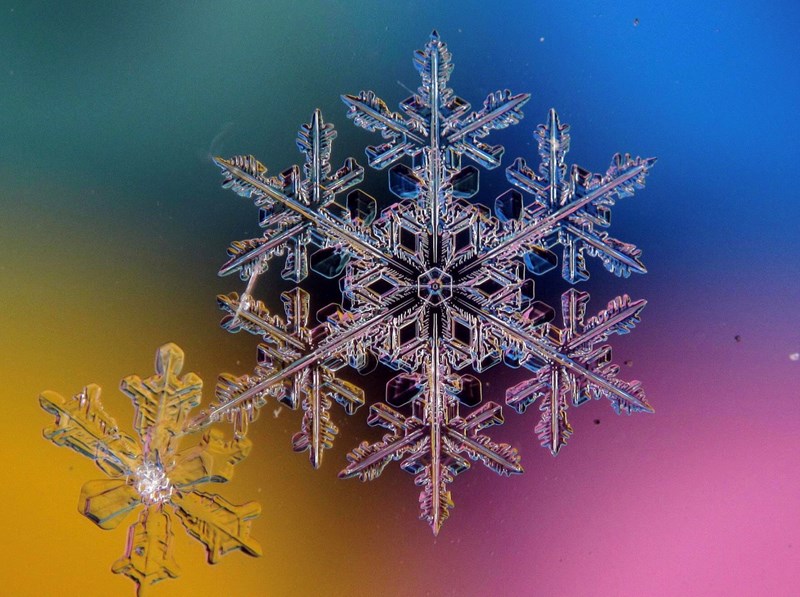 Från formen av enskilda kristaller kan ofta symmetrin i kristallen observeras, som i fallet med snöflingorna som alltid är hexagonala - precis som hur molekylerna i kristallen är ordnade.